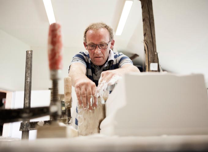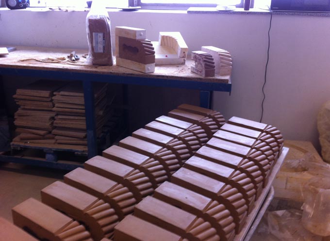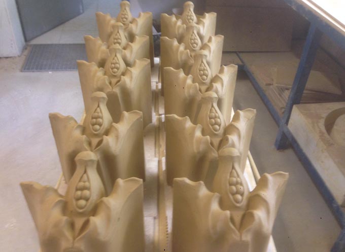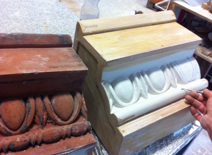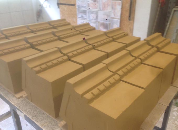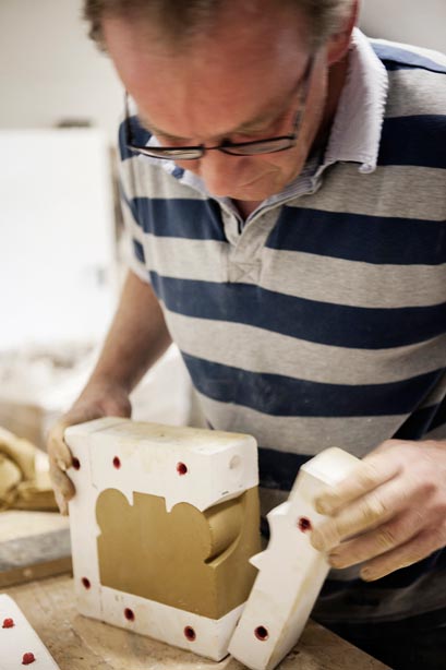 Entsprechend den Vorgaben des jeweiligen Bauvorhabens passen wir auch den Formenbau an. Für die Herstellung der original handgeformten Klosterformatziegel benutzen wir traditionell Holzformen. Nur dadurch sind wir in der Lage die geforderten Oberflächen aber auch physikalischen Eigenschaften der neu produzierten Ziegel dem Original anzupassen. Zur Herstellung von stranggezogenen Ziegeln verwenden wir Formen aus Stahl. Diese werden von uns in eigener Werkstatt erstellt. Auch hier wird für nahezu jedes Bauvorhaben eine neue Form zur Nachfertigung erstellt. Nur so ist es möglich die exakten Abmessungen nachzubilden, damit beim Austausch defekter Ziegel ein homogenes Gesamtbild erzielt wird. Im Bereich der Baukeramik verwenden wir Gipsformen für die Nachfertigung der doch oftmals sehr filigranen Stücke. In unserer eigenen Gipsformenwerkstatt werden die Formen originalgetreu nachgebaut.